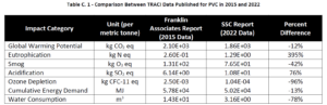 The Vinyl Institute has worked with Sustainable Solutions Corporation to conduct and release life cycle assessments for the industry and VI members. When comparing the most recent LCA to the previous one in 2015, the findings show an industry improving its sustainability record across several metrics, including a 12% decrease in global warming potential. You can see the full findings and comparisons in the image below.